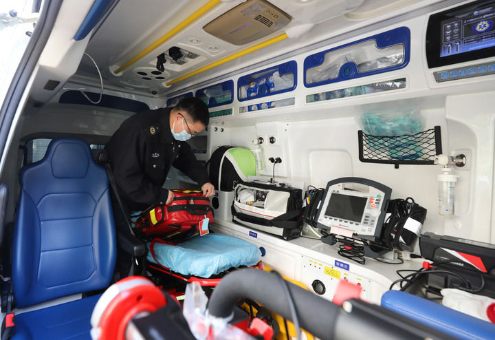 急救医师曹鑫在出发前检查整理救护车急救药品和装备。新华社记者 方喆 摄