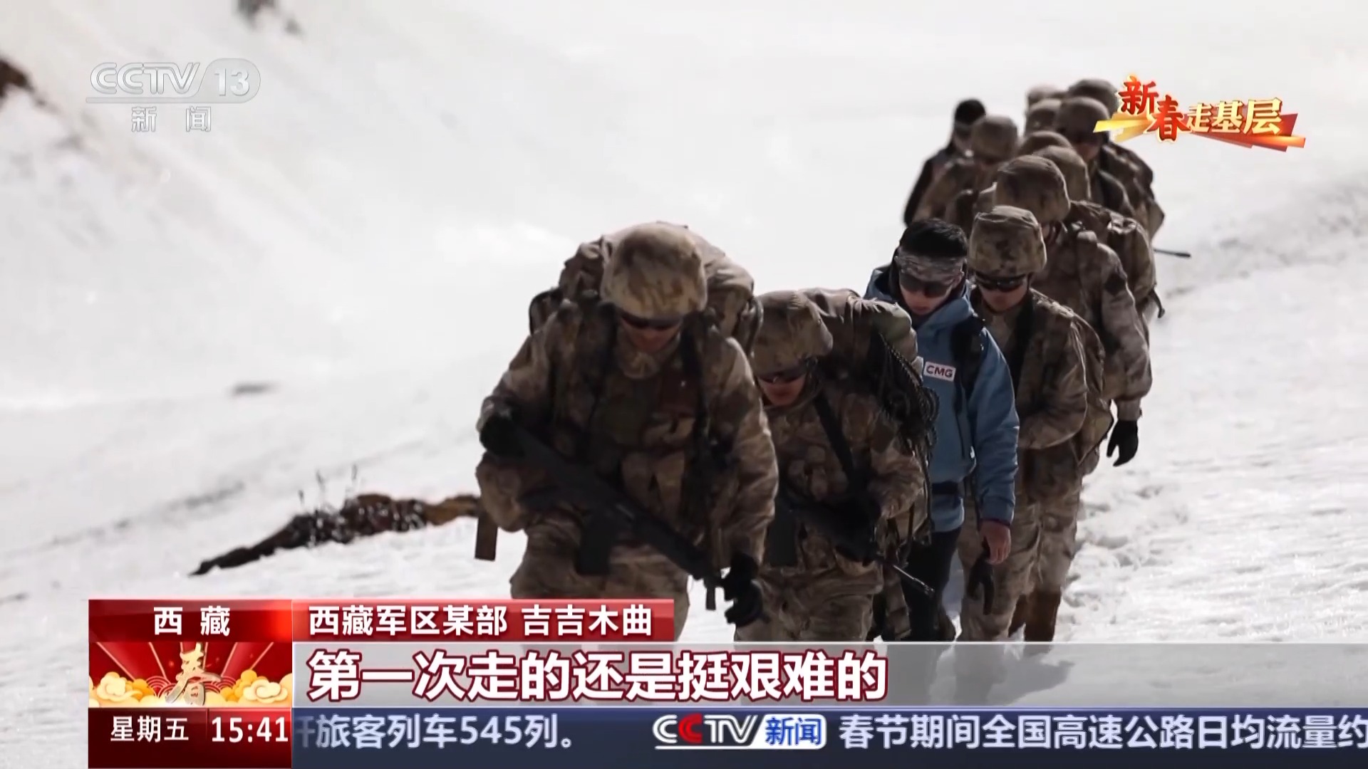 在春节万家灯火、阖家团圆的时候,总有人在守护这份欢乐祥和、平安喜乐。西藏山南军分区老虎嘴边防连驻守在海拔3200多米的喜马拉雅山南麓,连队常年担负着繁重的边防巡逻任务。今天,一起跟随边防官兵踏上海拔4600多米的艰险巡逻路。
