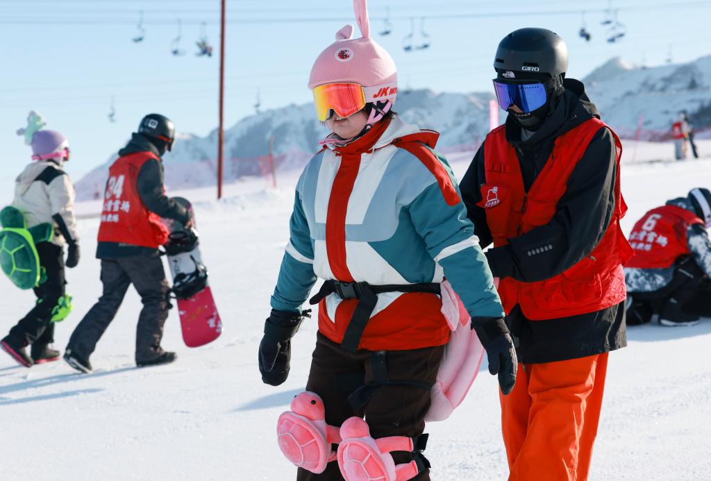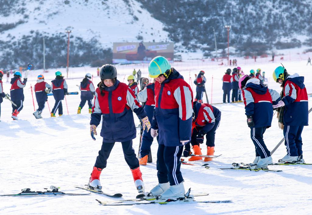 2024年12月25日,在位于乌鲁木齐县的新疆白云国际滑雪场,乌鲁木齐县永丰中学的学生在上滑雪课。新华社记者 王菲 摄