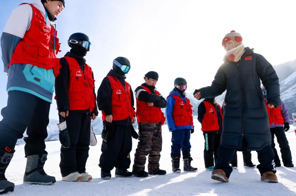 在新疆白云国际滑雪场,许秀娟(右一)在为新聘的雪场教练做培训。新华社记者 王菲 摄