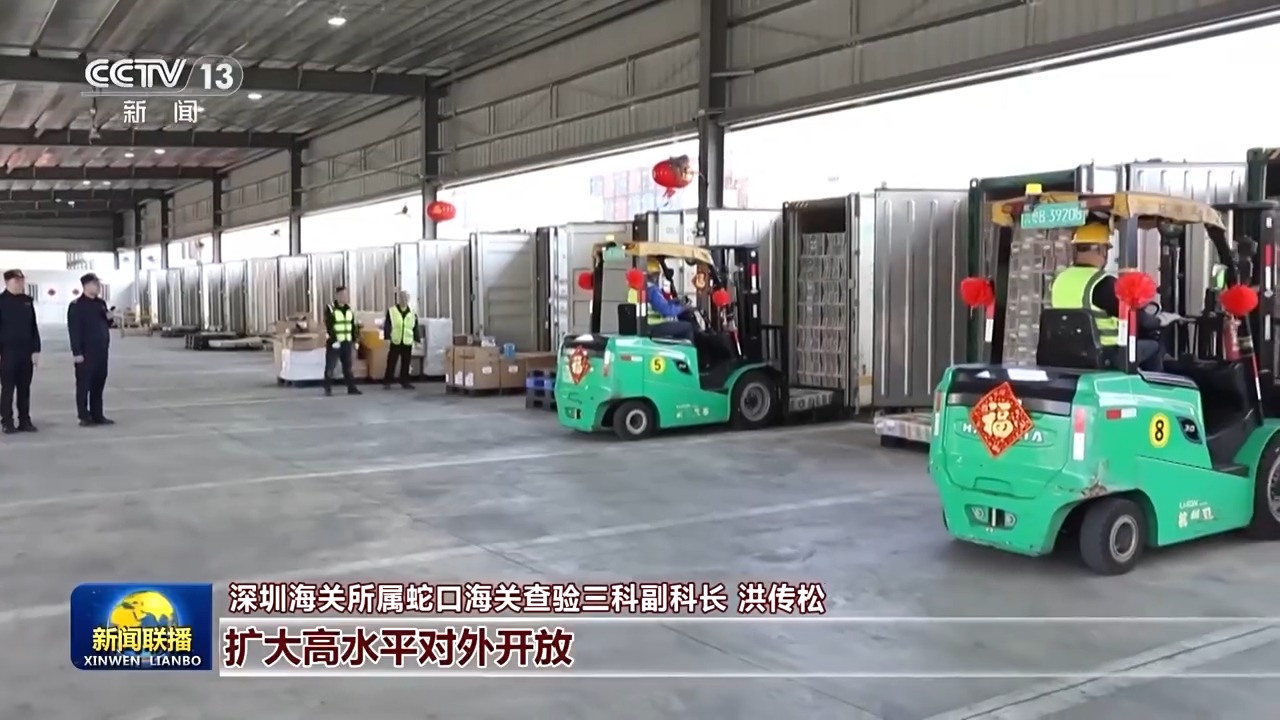 深圳海关所属蛇口海关查验三科副科长 洪传松:习近平总书记指出,要进一步全面深化改革,扩大高水平对外开放。春节我们平均每天监管4万个左右集装箱的货物,通过码头180多条航线发往全球各地。新的一年,我们提升海关智能化、便利化水平,以外贸新成效,更好助力扩大高水平对外开放。