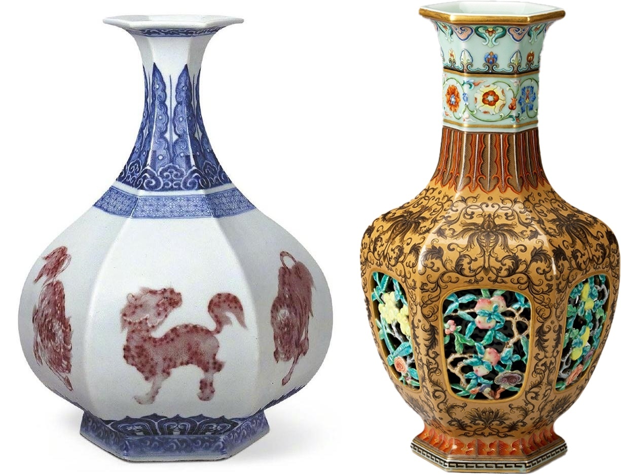 △其他材质的六方瓶,均为瓷器。左为清雍正·青花釉里红异兽纹六方瓶,故宫博物院藏;右为清乾隆·外粉彩内青花镂空花果纹六方套瓶,首都博物馆藏。