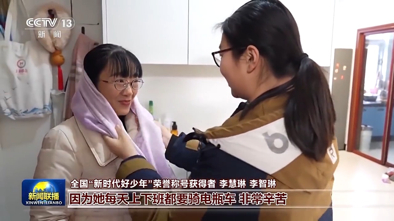 全国“新时代好少年”荣誉称号获得者 李慧琳 李智琳:我拿的这个是送给爸爸轮椅上的加绒坐垫,这个是我们送给妈妈的围巾,因为她每天上下班都要骑电瓶车,非常辛苦。