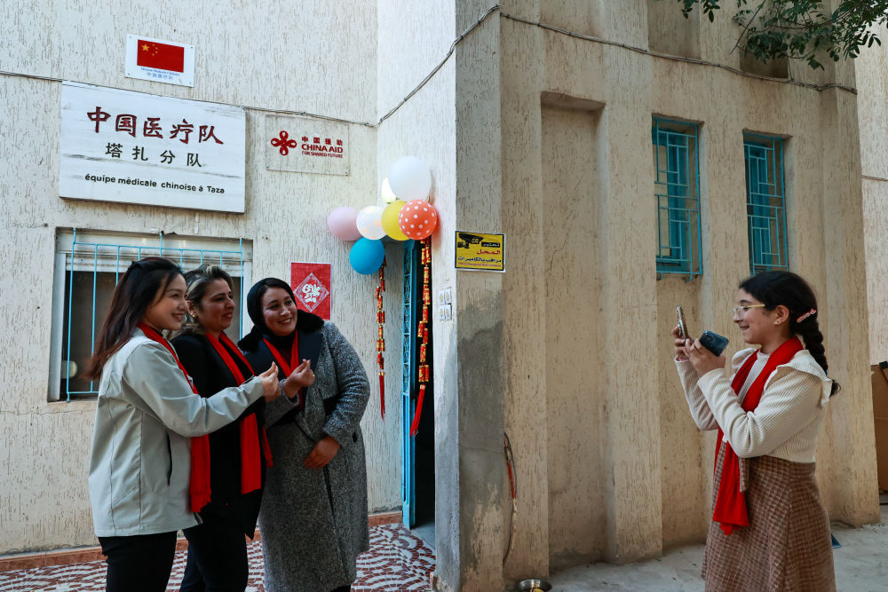 1月27日,在摩洛哥塔扎,中国援摩医疗队塔扎分队队员胡海艳(左一)与摩洛哥民众庆祝春节。新华社记者 霍晶 摄
