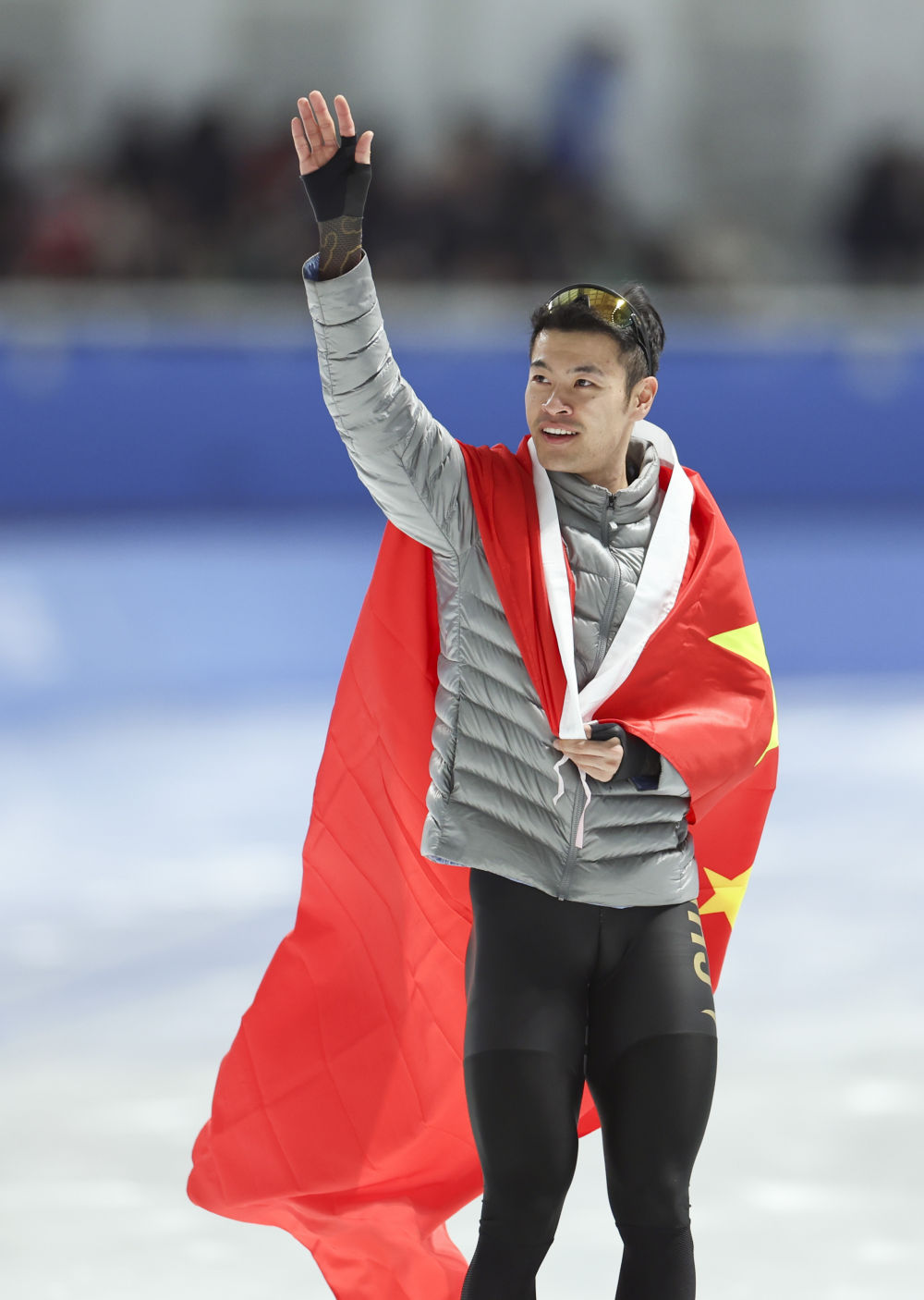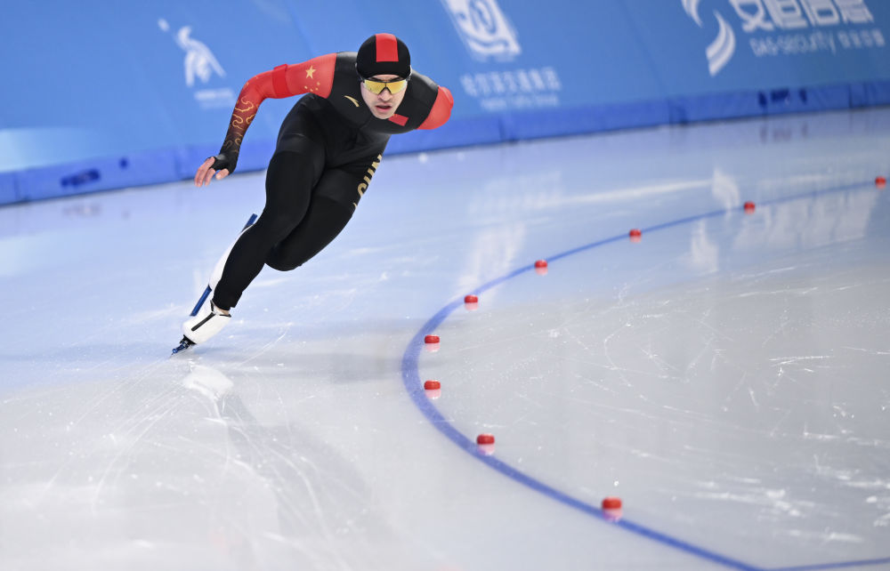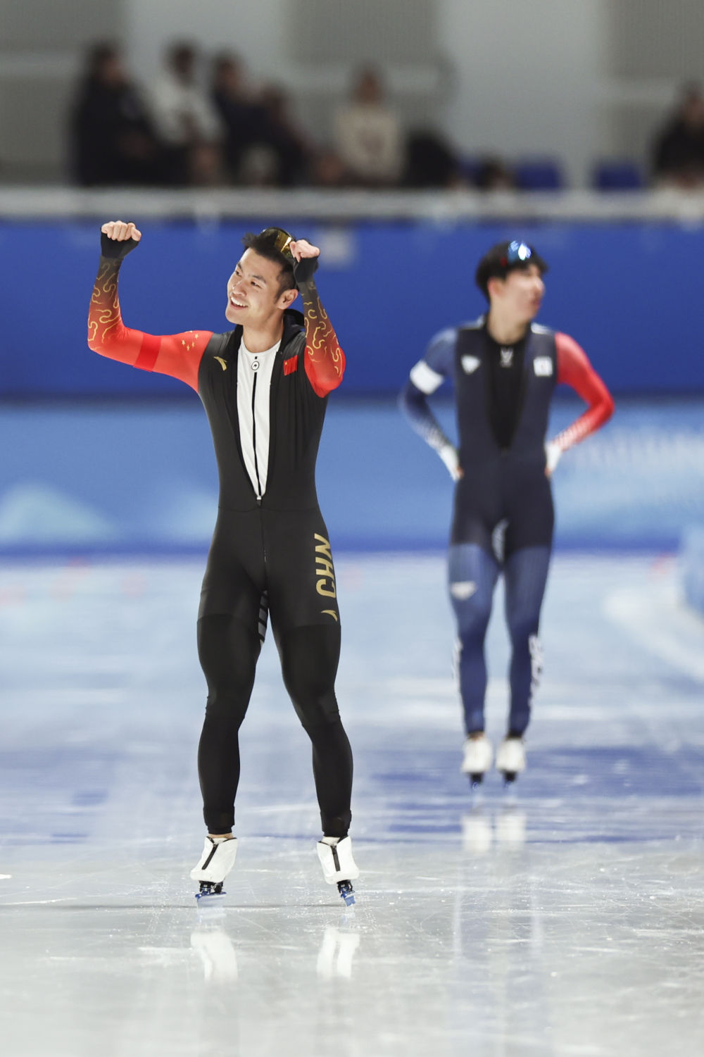 2月8日,在哈尔滨举行的第九届亚冬会速度滑冰男子1500米决赛中,中国选手宁忠岩获得冠军。