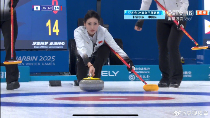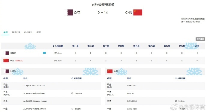 在今天进行的哈尔滨亚冬会女子冰壶循环赛中,中国队发挥稳健,上半场打出12-0。最终两队提前两局握手结束比赛,中国队以14-0战胜卡塔尔队,收获三连胜!