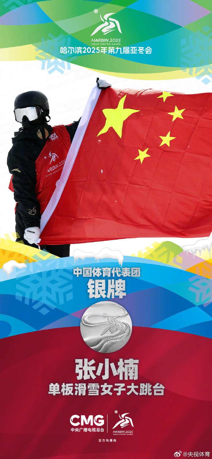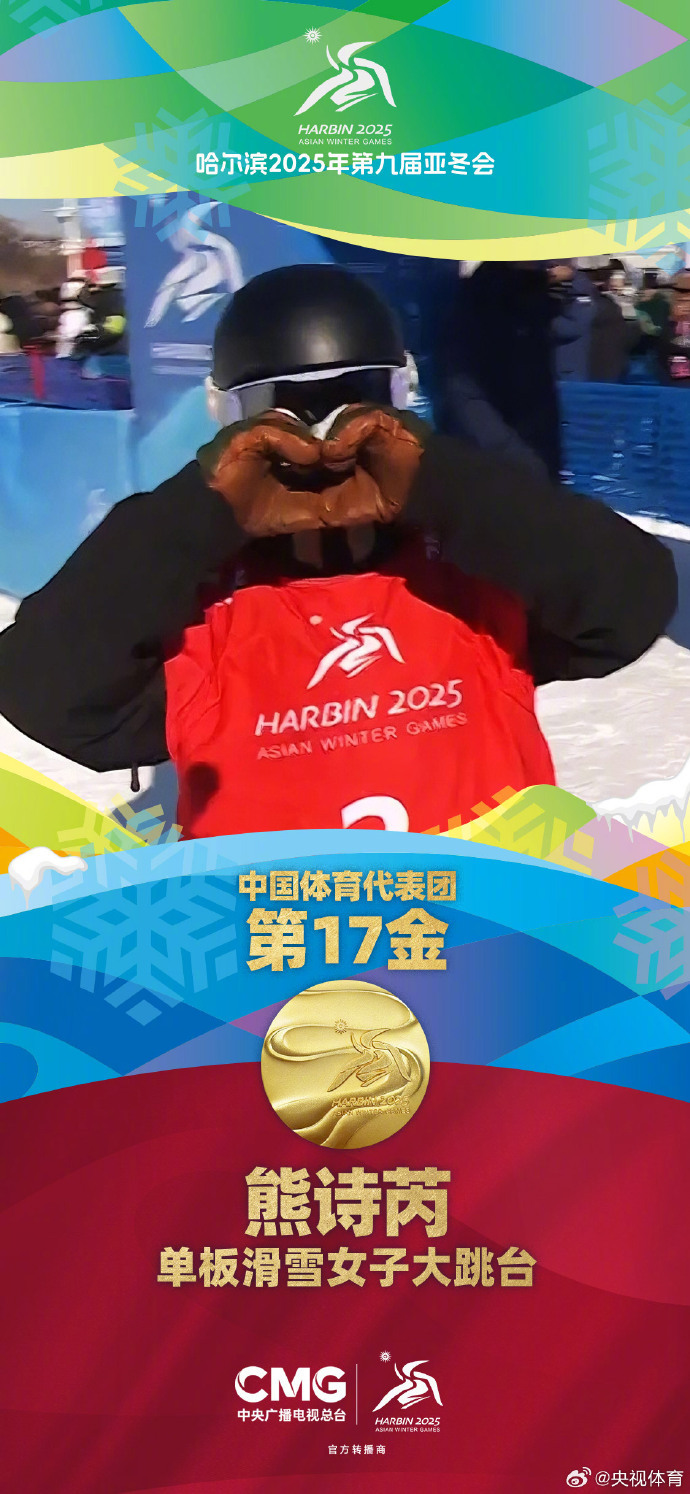 2月10日,哈尔滨亚冬会单板滑雪女子大跳台决赛,中国选手熊诗芮凭借前两轮总分164分的成绩夺得冠军,张小楠156.75分获得银牌。