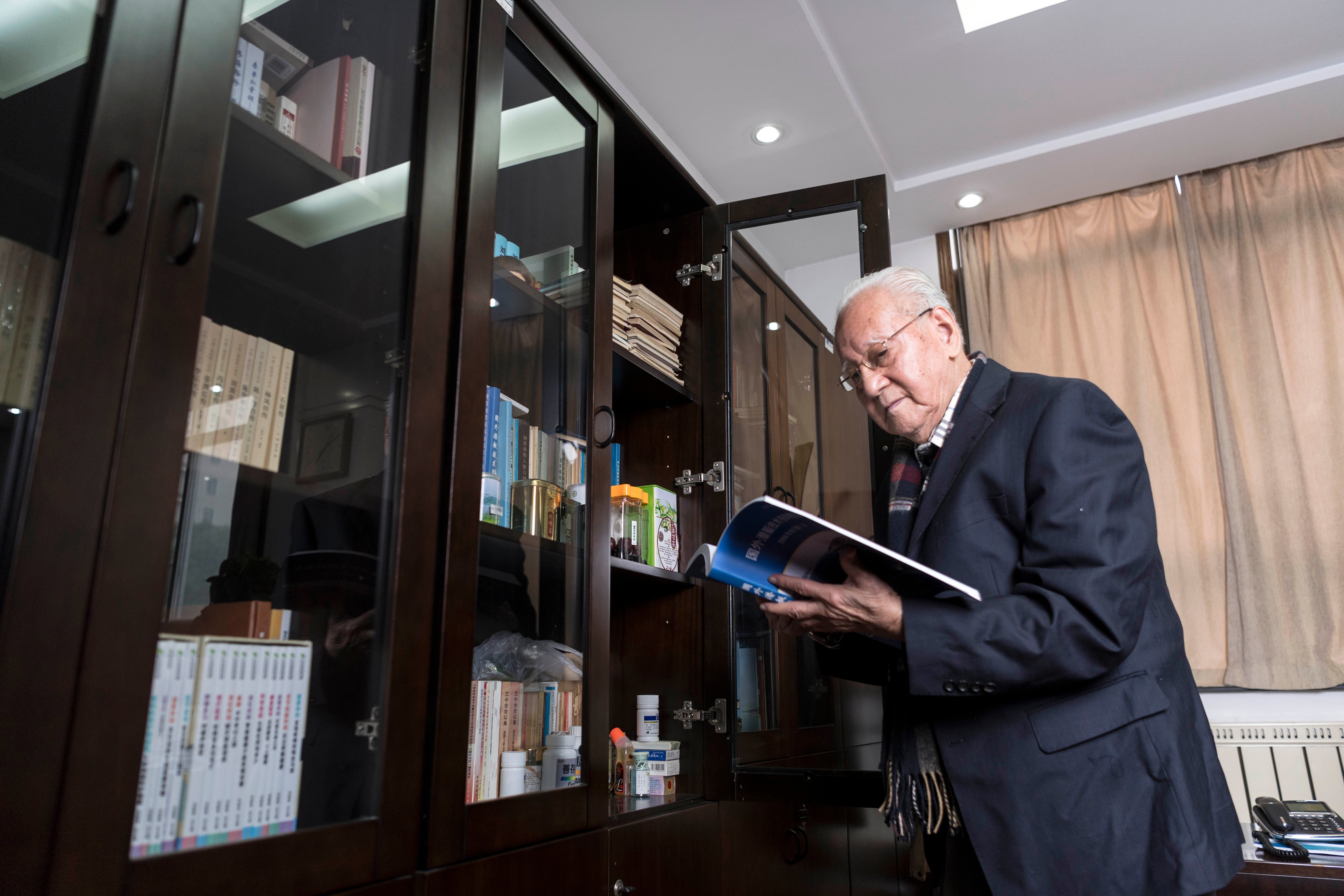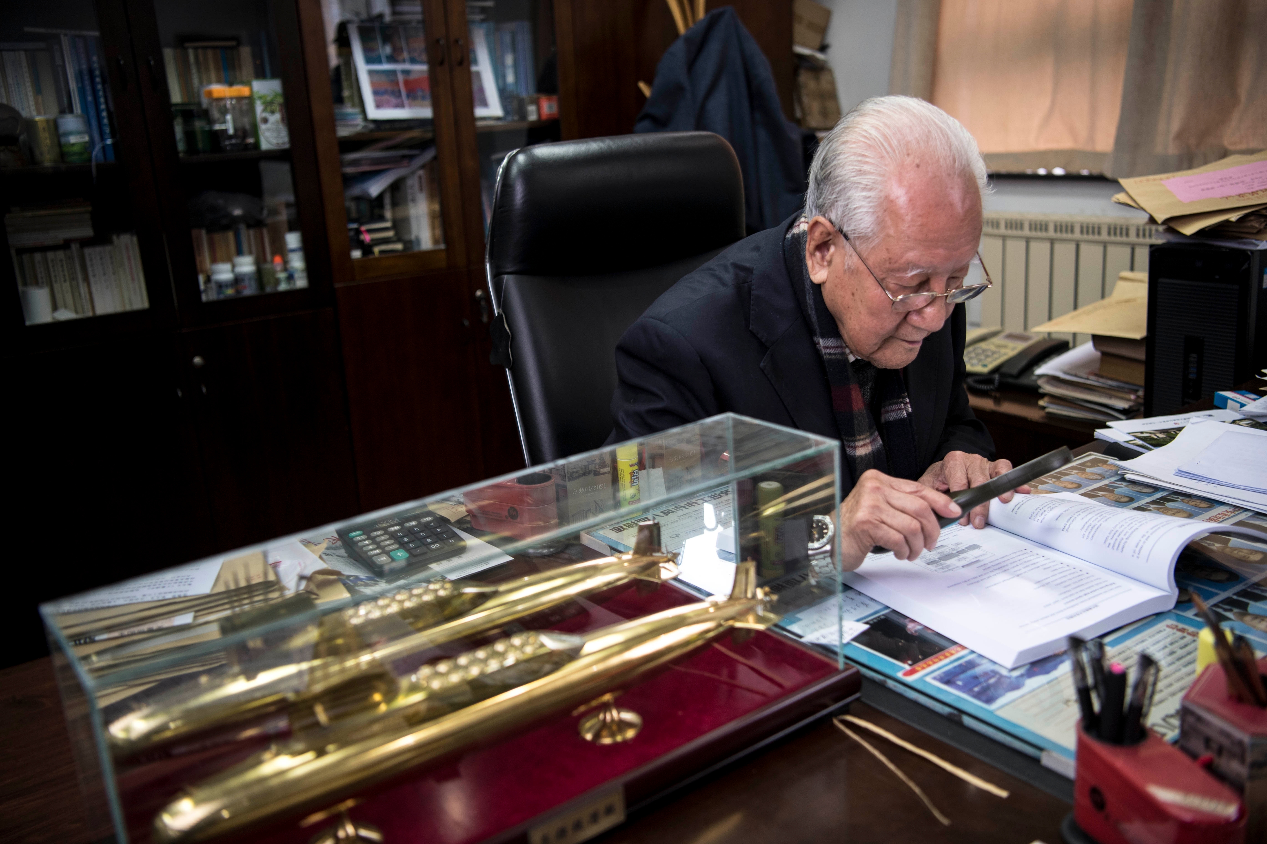 黄旭华院士在办公室查阅资料(2017年12月15日摄)。1970年12月26日,中国第一艘核潜艇下水。当“蓝色巨鲸”奔向大海之际,在场的人无不热血沸腾,他更是喜极而泣。新华社记者 熊琦 摄