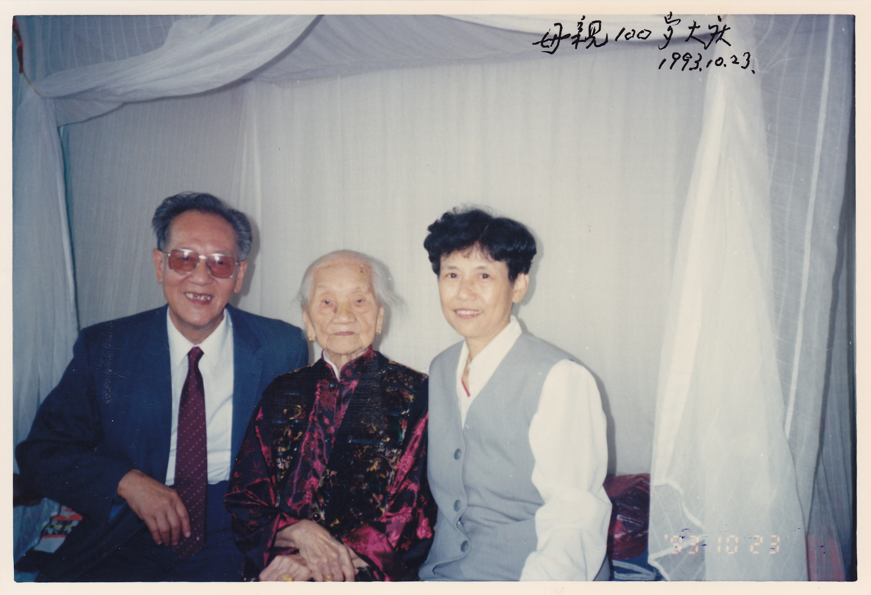 黄旭华(左一)在母亲一百岁大寿时合影(资料照片,1993年10月23日摄)。新华社记者 熊琦摄