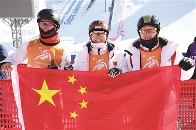 中国队选手(右起)齐广璞、徐梦桃、李心鹏在赛后合影。 中国体育报记者 安灵均 摄