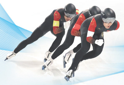 2月10日,中国队选手高亭宇、廉子文、宁忠岩(从前至后)在速度滑冰男子短距离团体追逐项目比赛中。人民日报记者 厉衍飞 摄