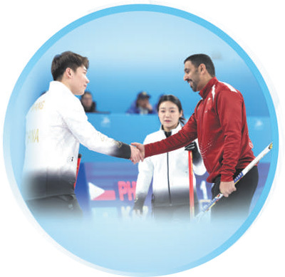 2月6日,中国队选手王智宇(左)和卡塔尔队选手在冰壶混双循环赛B组第八轮比赛后握手致意。新华社记者 王楷焱 摄
