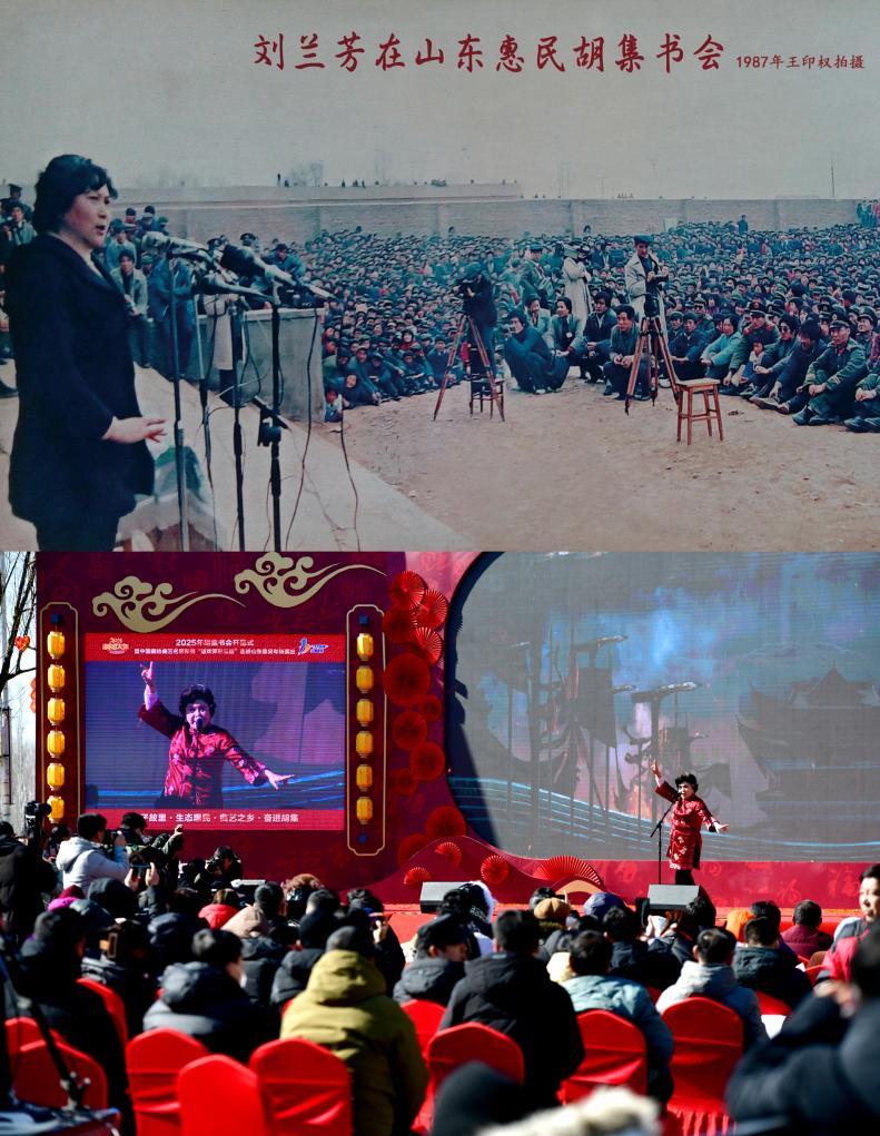 这是一张拼版照片。上图为:1987年刘兰芳在胡集书会演出时的场景。(王印权 摄);下图为:2025年刘兰芳在胡集书会演出时的场景。(新华社记者 郭绪雷 摄)