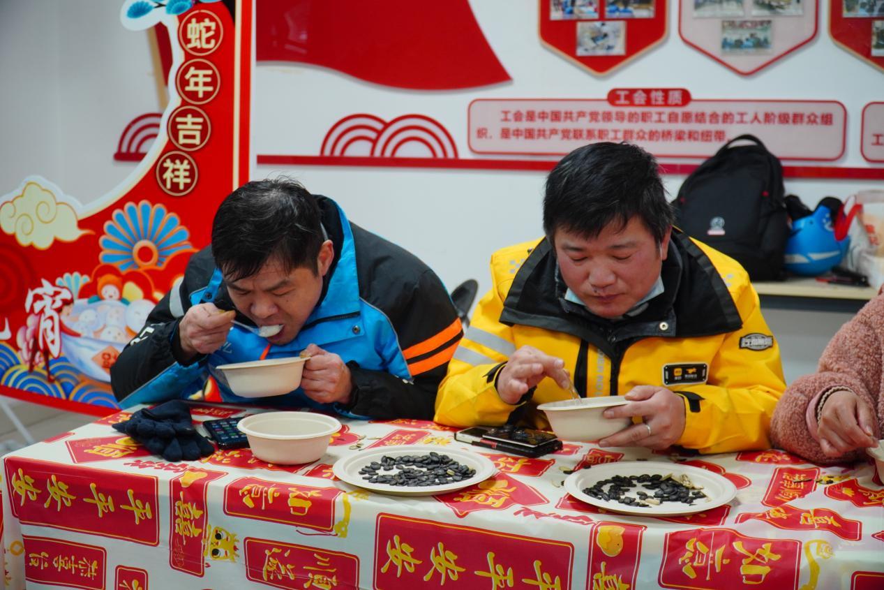 活动最后,群团部门还与骑手组队比拼“筷子夹汤圆”“驿站服务知多少”等趣味问答,现场其乐融融,骑手刘顺在寄语墙上写道:武昌工会驿站就像我们自己的家,团圆于此,关爱彼此,温暖着我们奔波的路。