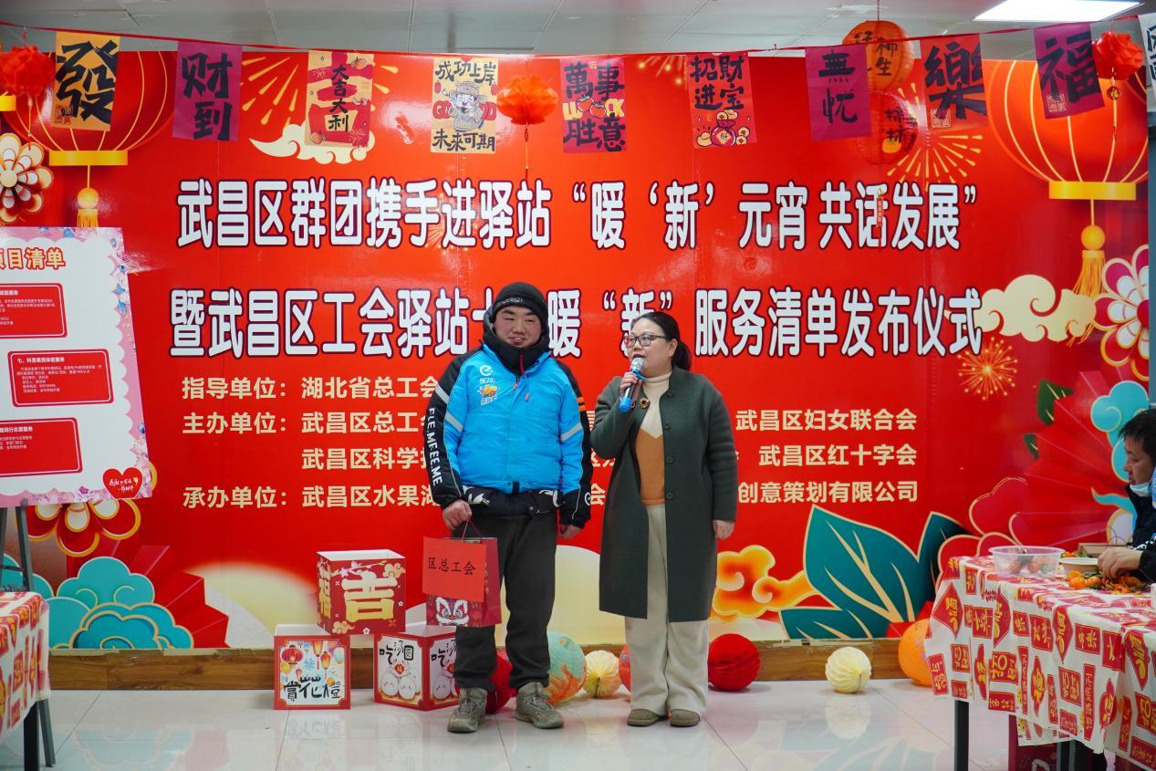 活动现场还举行了“新年心愿”兑现活动,这是武昌区总工会启动“群团携手进驿站,服务群众到一线”活动以来专门定制的服务项目,早在2024年12月底就依托全区73个驿站开展新年心愿征集活动,通过联手群团部门的资源和优势,特意赶在元宵节前为6位“许愿者”圆愿。曾写下“想要一双运动鞋”的孙师傅,从工会干部手中接过运动鞋时红了眼眶:“没想到年前在驿站随口一提的微心愿今天真的实现了。”随后6位“许愿骑手”分别分享自己许愿的暖心故事,他们的“微心愿”都在群团部门的助力下得以实现。