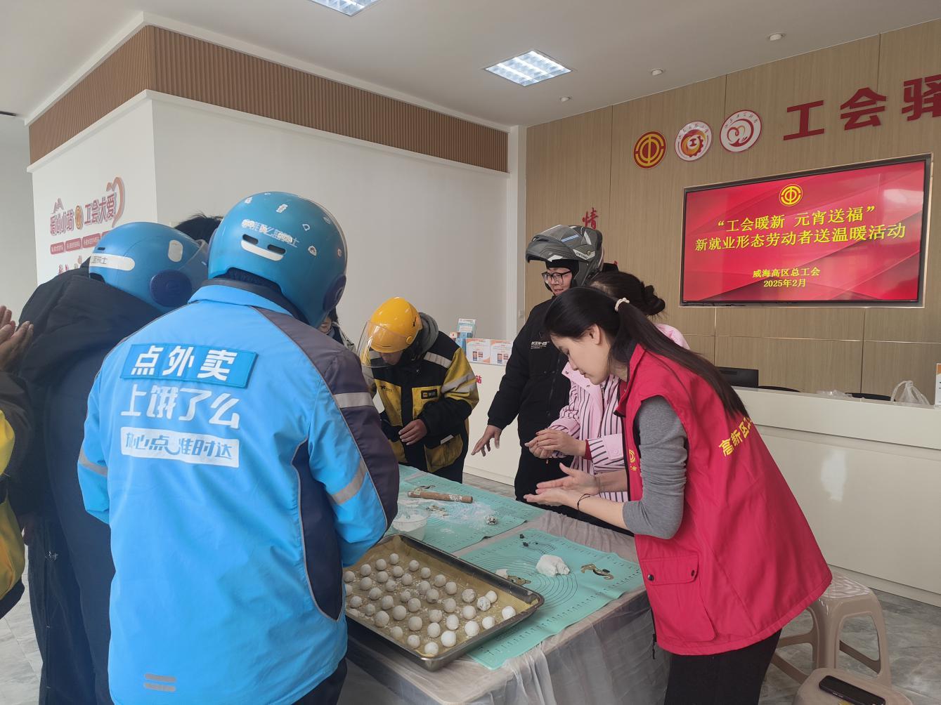 2月11日下午,山东威海高区总工会示范性工会驿站内热闹非凡,职工志愿者与来自美团、饿了么的20余名外卖小哥欢聚一堂,享受元宵节的喜悦。