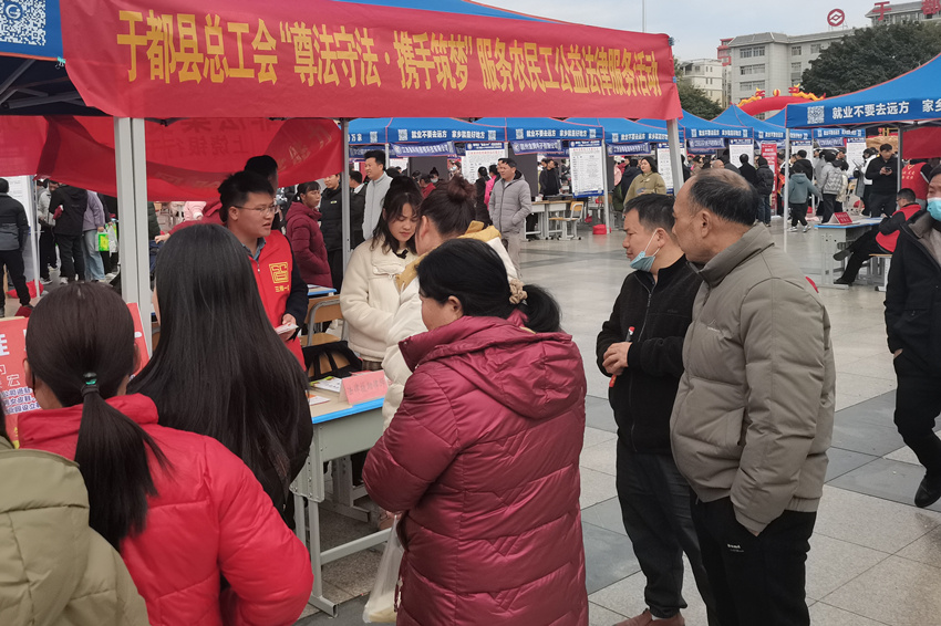 近日,江西省于都县总工会在赣州市“就业580”(就业我帮你)暨于都县2025年春季企业用工现场招聘会现场开展“尊法守法·携手筑梦”服务农民工公益法律服务活动。