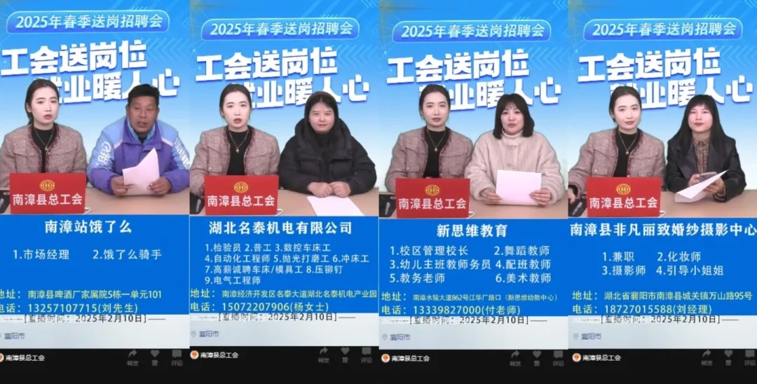 中工网讯 2月10日,湖北襄阳南漳县总工会在职工多功能活动厅通过微信视频号举办“工会送岗位 就业暖人心”春季送岗线上招聘会。