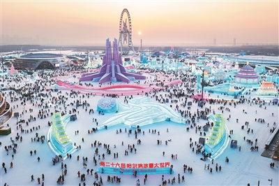 游客在哈尔滨冰雪大世界园区游玩。新华社记者 谢剑飞 摄