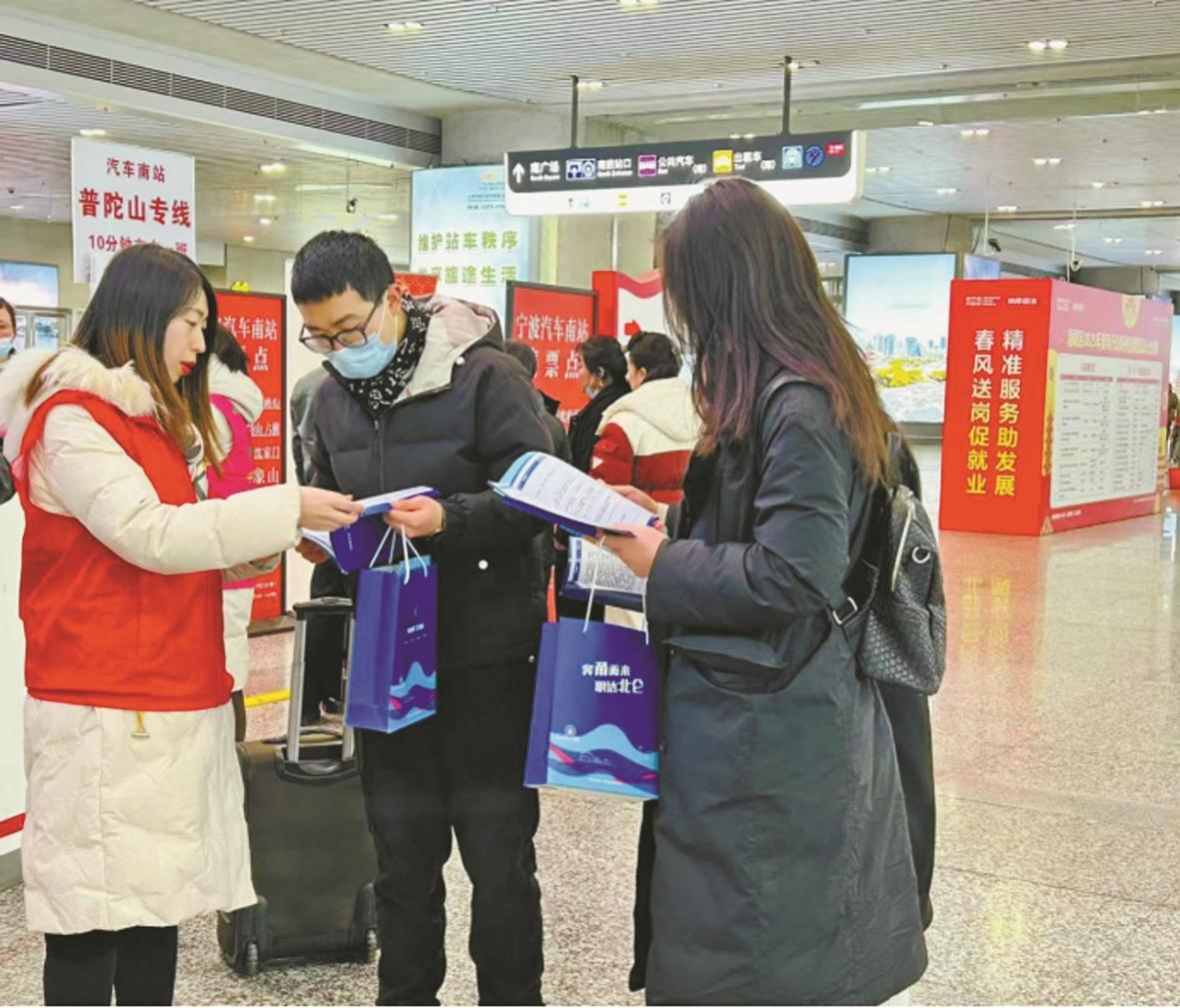 相关工作人员搬来“职达北仑就业礼包”,在铁路宁波站设立了两个服务站点,由身穿红马甲的志愿者向求职者发放“就业大礼包”。
