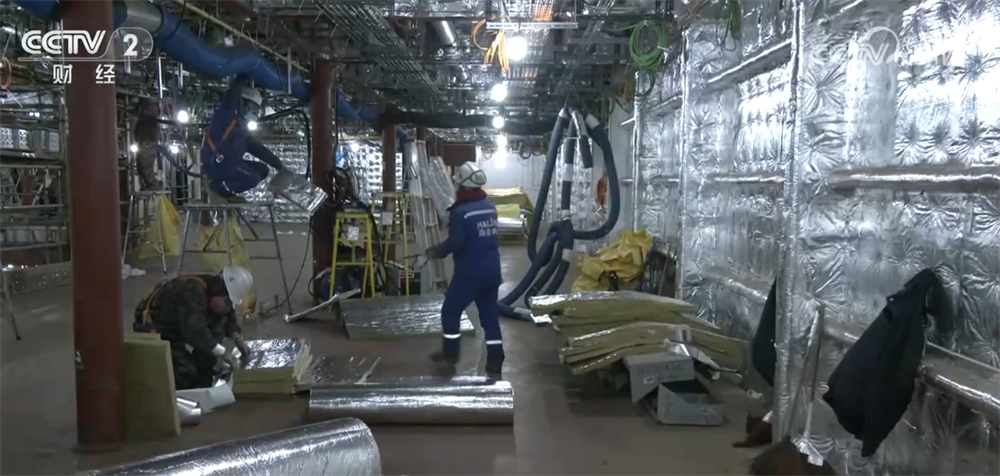 正在进行电缆拉线的刘师傅,大年初八一上班就和工友们回到了岗位。他告诉记者,像电缆铺设的这类细活必须依靠人工一点点来完成。而全船各类电缆长度加起来足足有4700公里左右,大约相当于从上海到新疆和田的距离。