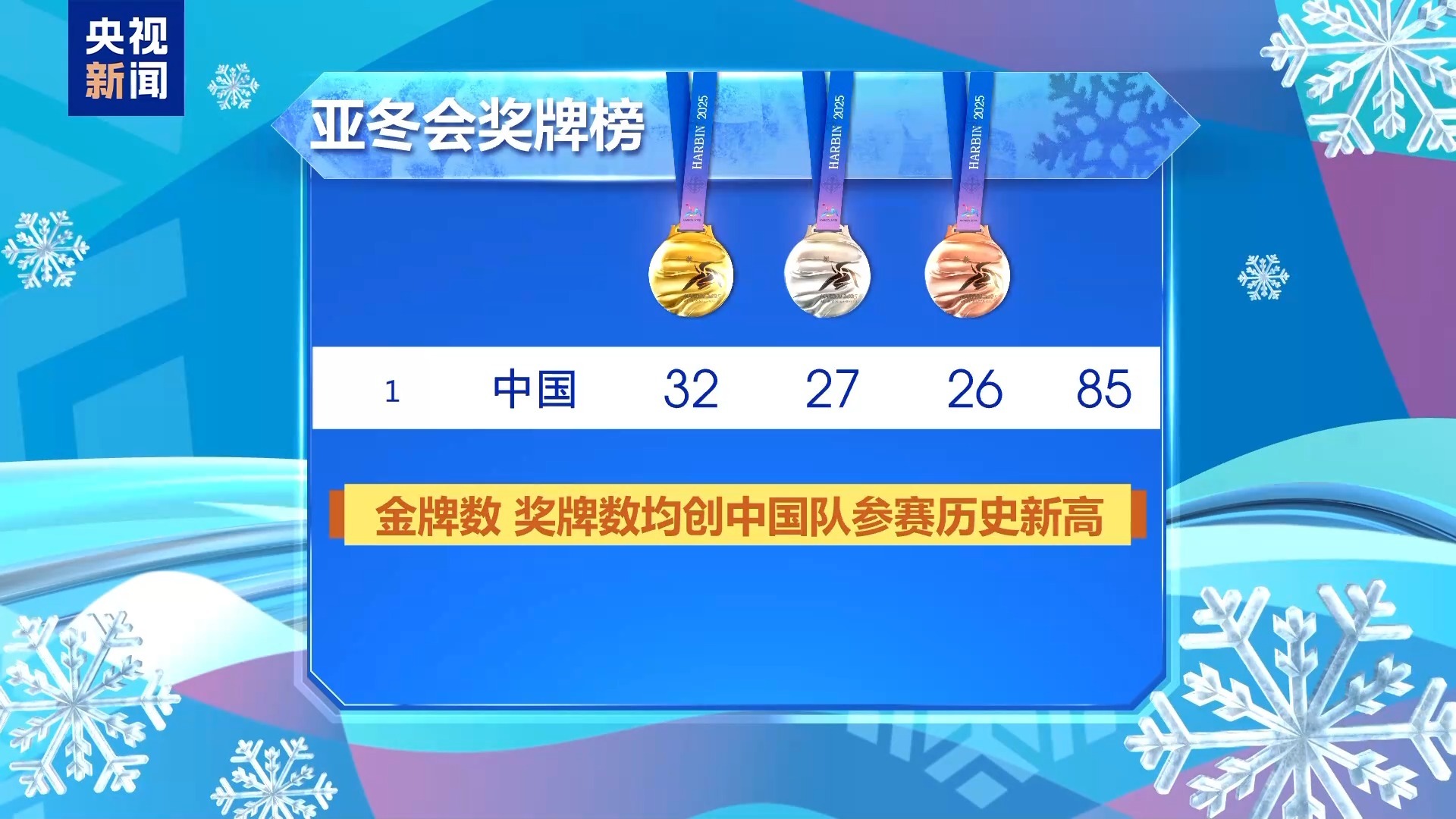 本届亚冬会中国体育代表团参加了全部6个大项11个分项64个小项的比赛,以32金27银26铜共85枚奖牌,位居金牌榜、奖牌榜首位,金牌数、奖牌数均创中国队参赛历史新高。