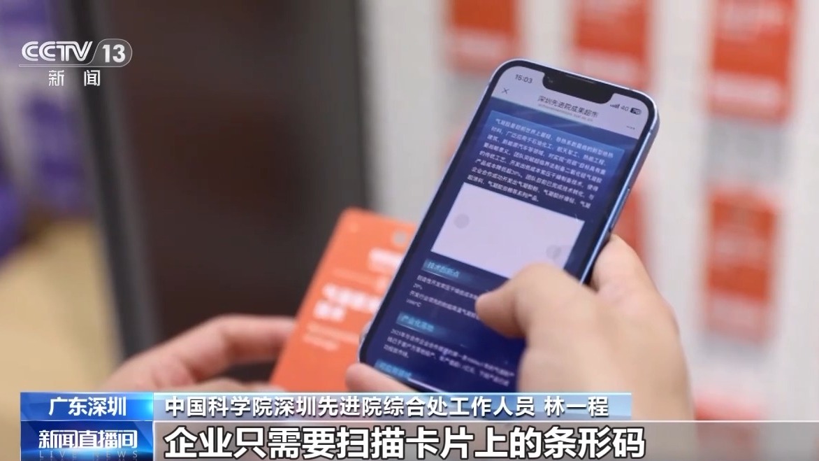 中国科学院深圳先进院综合处工作人员 林一程:企业只需要扫描卡片上的条形码,就能够在这上面看到他想要的一些技术成果以及成果完成人的一些信息。如果他对这张卡片感兴趣还可以打包带走,卡片后面还有二维码,可以通过手机扫码识别了解更多的信息。