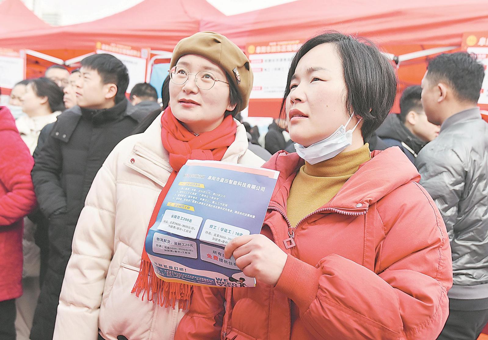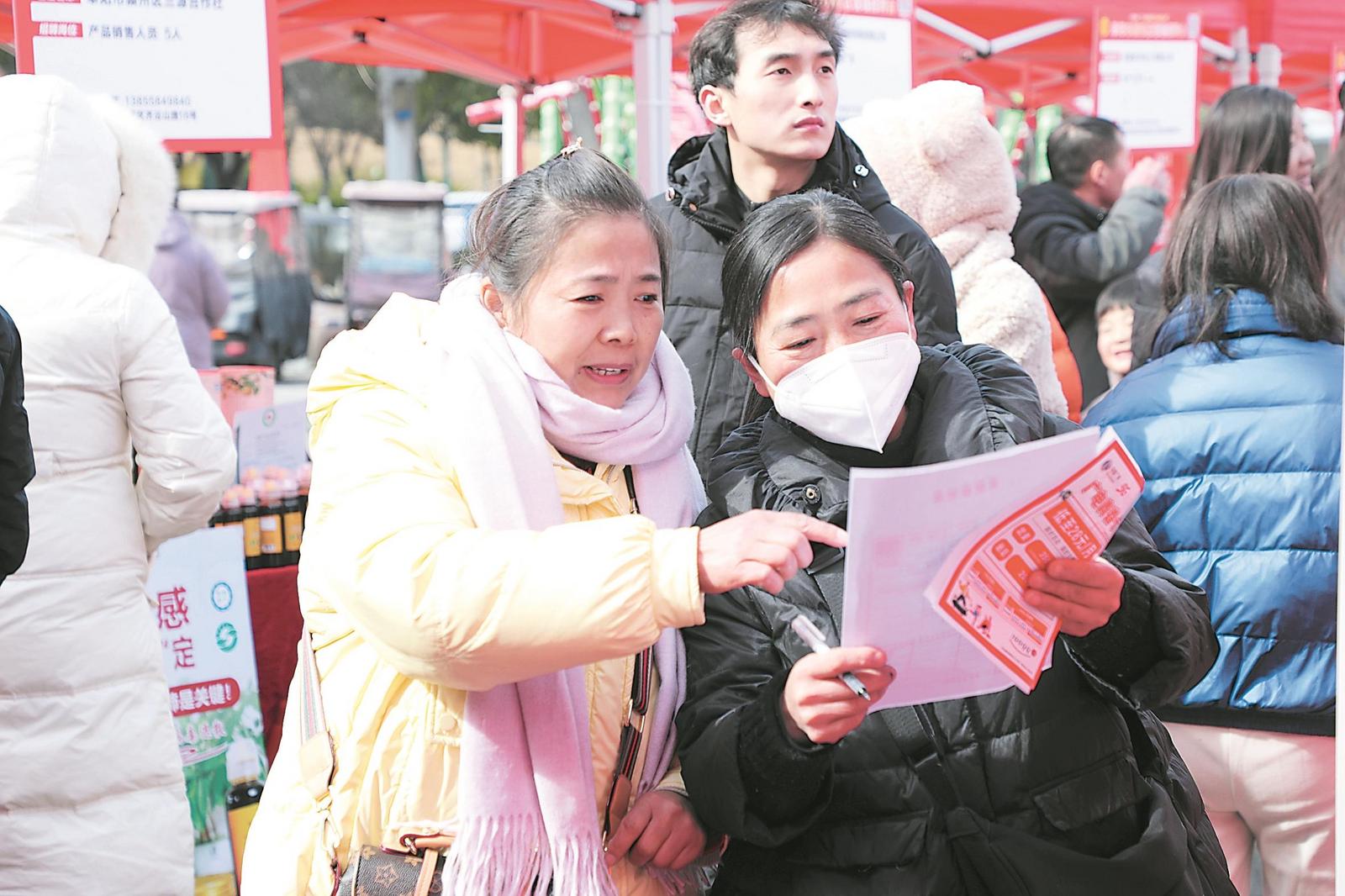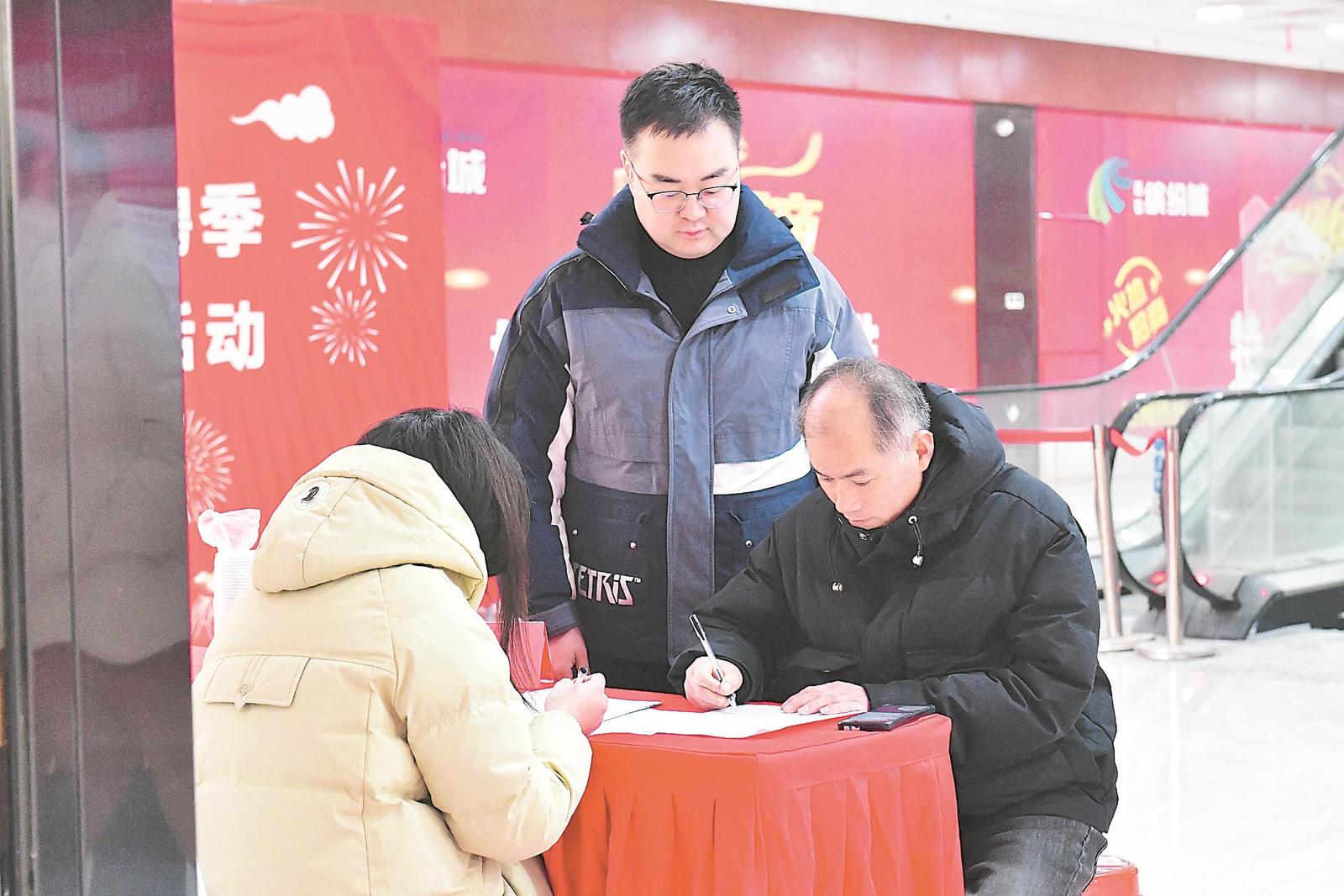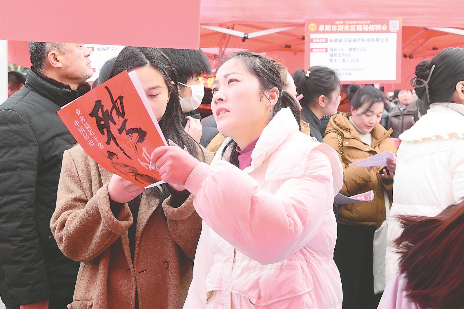 2月6日,在阜阳市颍东区“工会送岗位 乐业在江淮”招聘会现场,求职者了解招聘信息。安徽日报特约摄影 王彪 摄