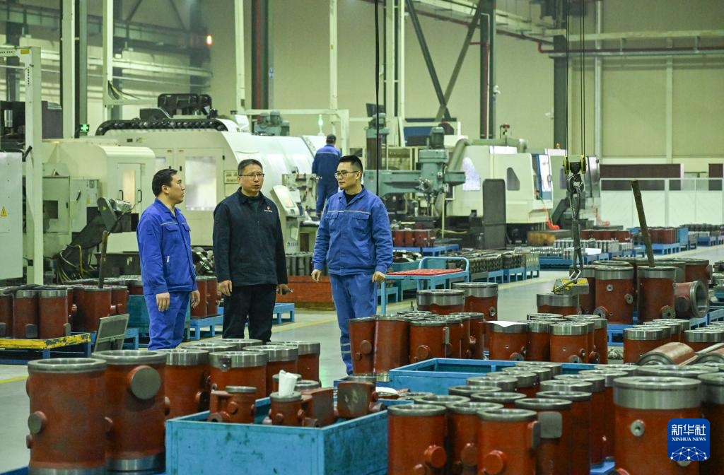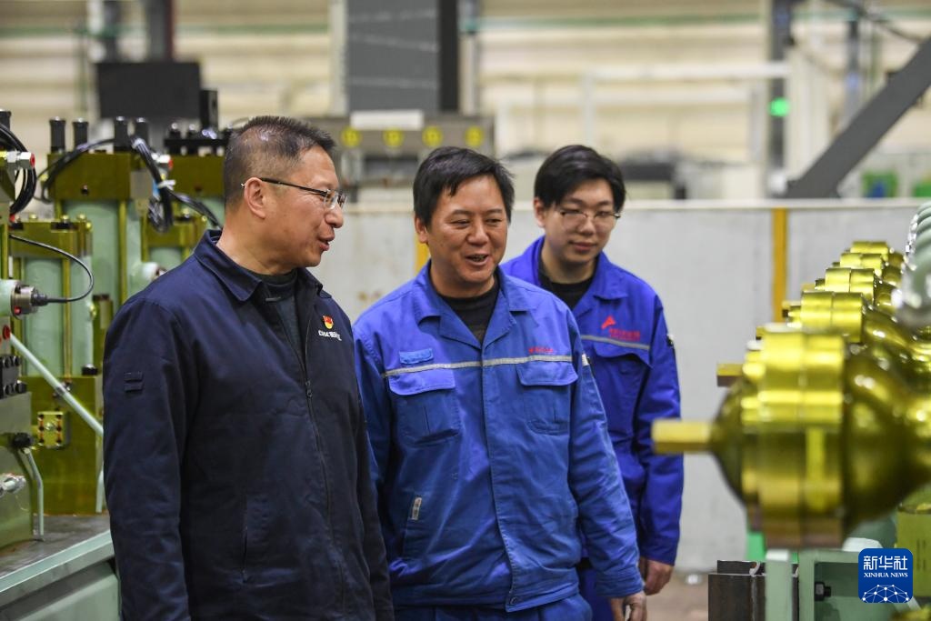 傅国涛(中)在重庆红江机械有限责任公司机械加工车间与同事交流(2025年2月11日摄)。新华社记者 王全超 摄