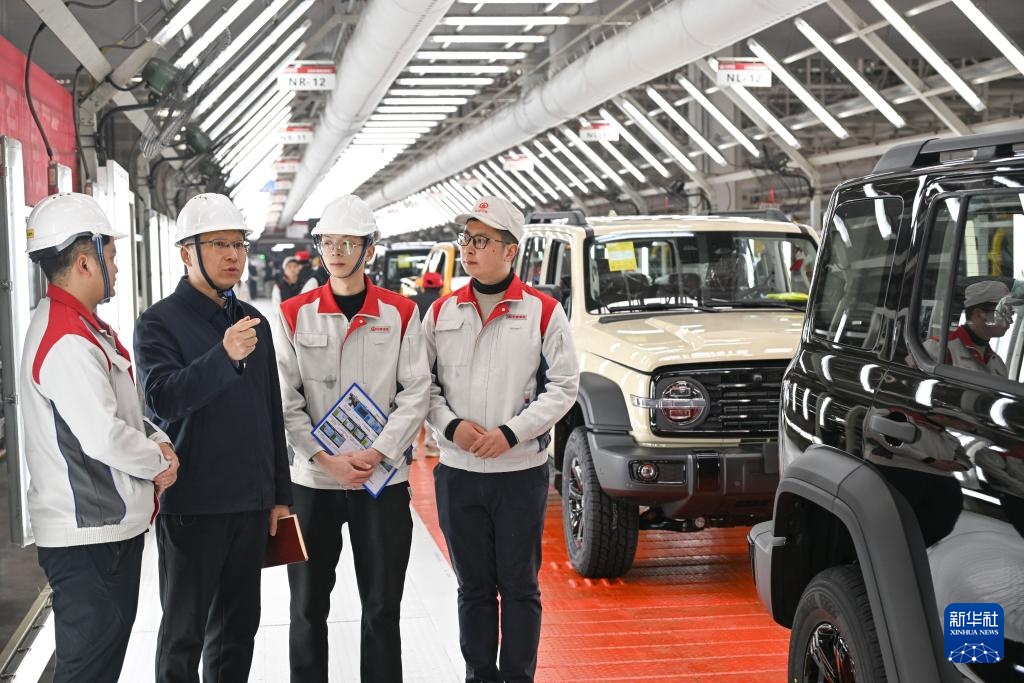 傅国涛(左二)在长城汽车重庆永川工厂智能化生产车间调研(2025年2月11日摄)。新华社记者 王全超 摄