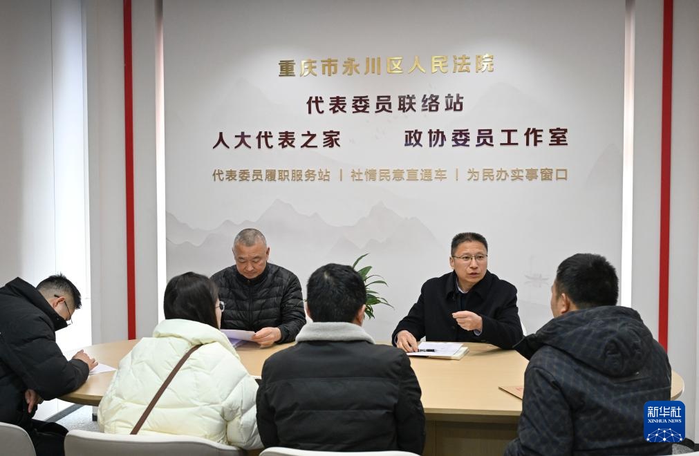 傅国涛(右二)在重庆市永川区法院诉讼服务中心参与案件调解(2025年2月11日摄)。新华社记者 王全超 摄