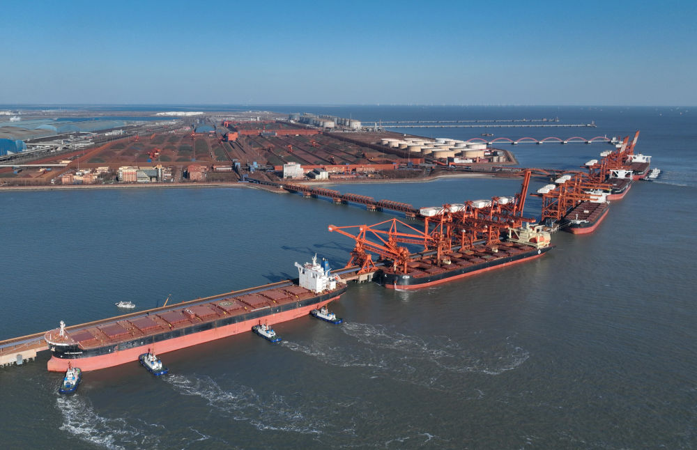 2025年1月9日,轮船靠泊在河北唐山港曹妃甸港区矿石码头卸载(无人机照片)。新华社记者 杨世尧 摄