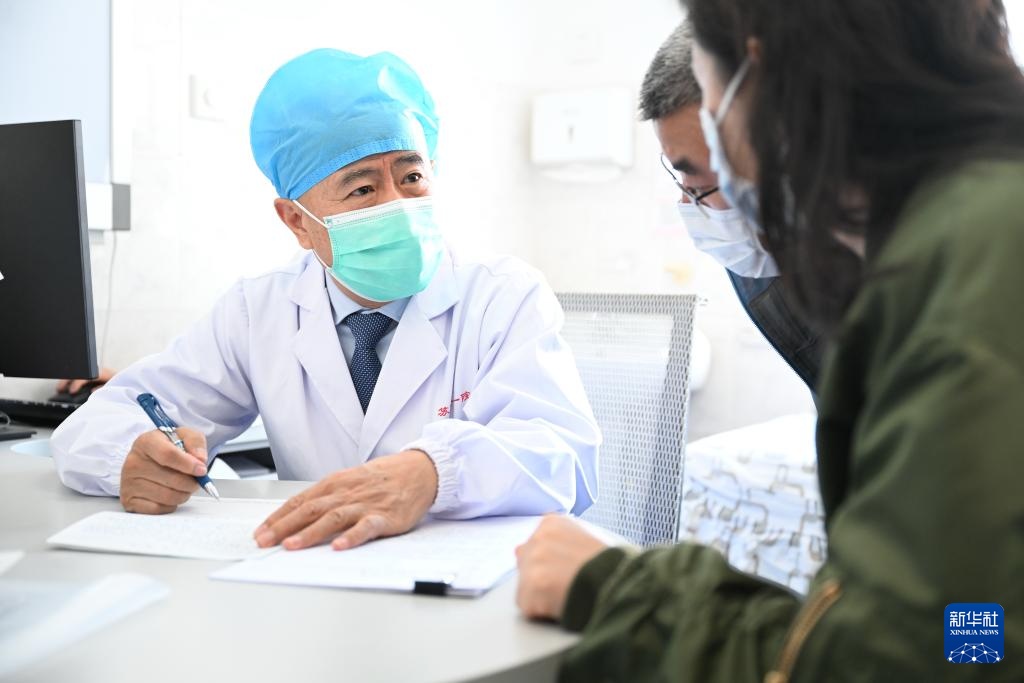 在苏州大学附属第一医院血液科,吴德沛和门诊患者家属交谈(2025年2月18日摄)。新华社记者 季春鹏 摄