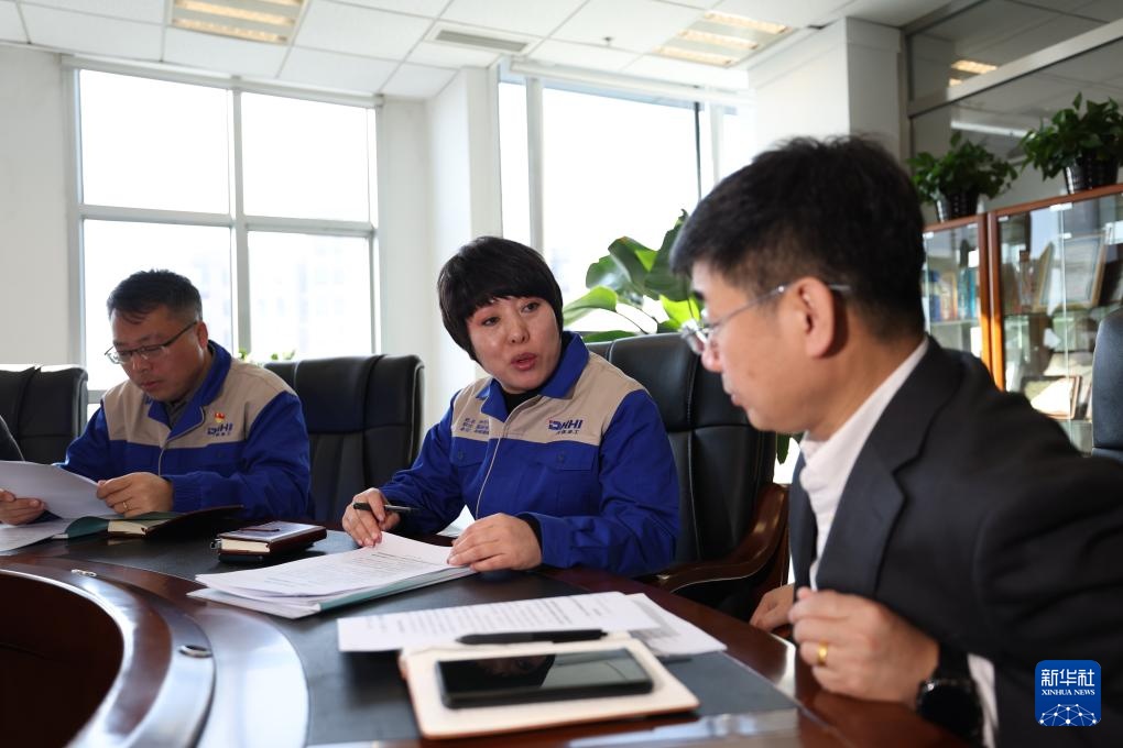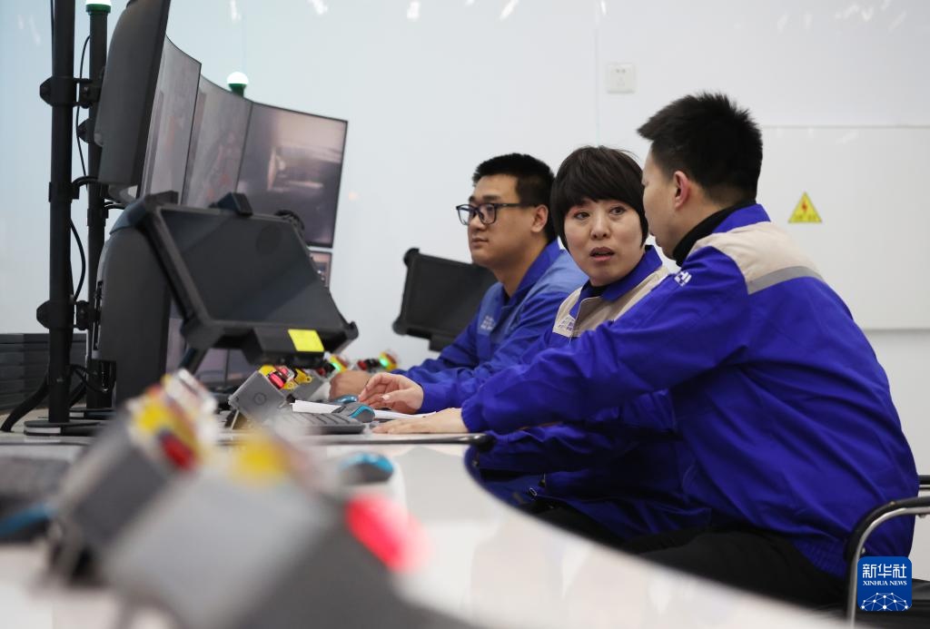 在大连华锐重工集团股份有限公司曲轴公司,孙元华(中)和同事在中控室进行技术交流(2025年2月20日摄)。新华社记者 杨青 摄
