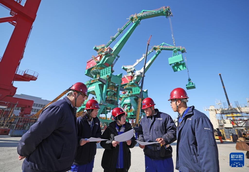 在大连华锐重工集团股份有限公司港口机械制造事业部,孙元华(中)和同事在工程安装现场交流工作(2025年2月20日摄)。新华社记者 杨青 摄