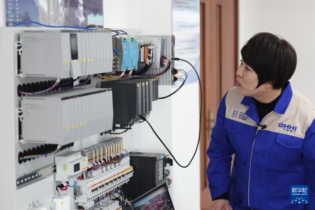 在大连华锐重工集团股份有限公司智能化实验室,孙元华查看国产自动化控制系统应用设备(2025年2月20日摄)。新华社记者 杨青 摄
