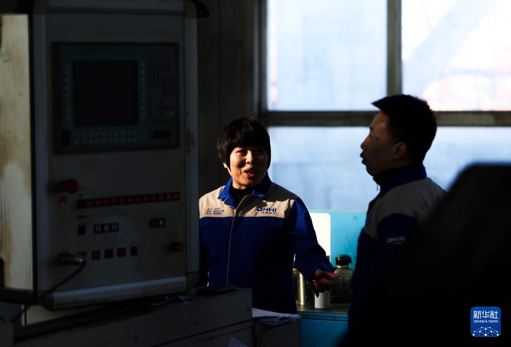这是在大连华锐重工集团股份有限公司港口机械制造事业部施工现场拍摄的全国人大代表孙元华(2025年2月20日摄)。新华社记者 杨青 摄