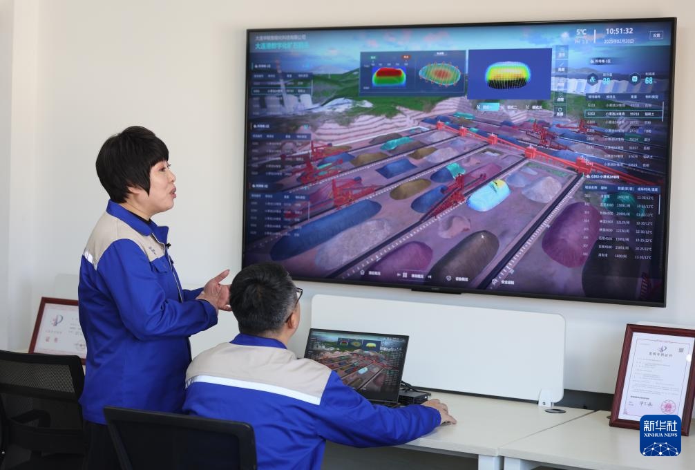 在大连华锐重工集团股份有限公司智能化实验室,孙元华(左)和同事操作大连港数字化矿石码头系统(2025年2月20日摄)。新华社记者 杨青 摄