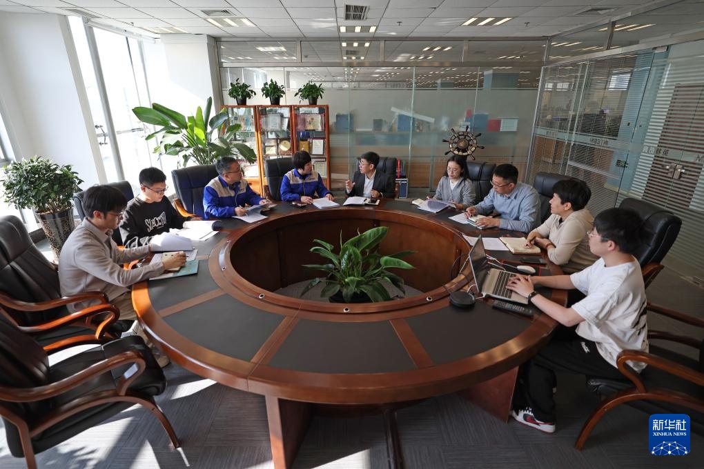 在英特工程仿真技术(大连)有限公司,孙元华(左四)和公司工作人员进行工程软件研发技术交流(2025年2月20日摄)。新华社记者 杨青 摄