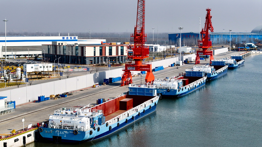2025年2月16日,在济宁能源集团山东新能船业有限公司,新能源船舶进行舾装作业(无人机照片)。新华社记者 郭绪雷 摄
