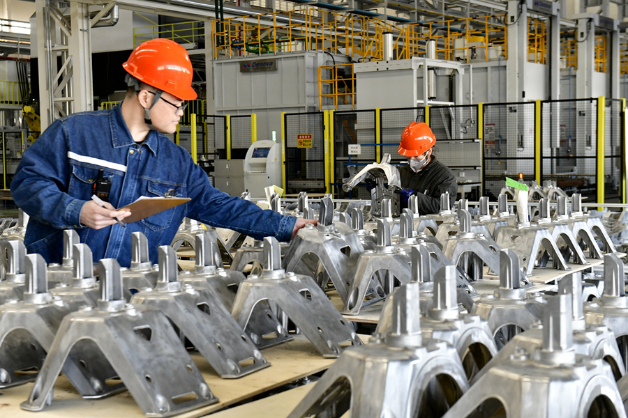 2025年2月26日,在山东宏灿材料科技有限公司,工作人员检查汽车轻量化精密铝合金结构件。新华社记者 郭绪雷 摄