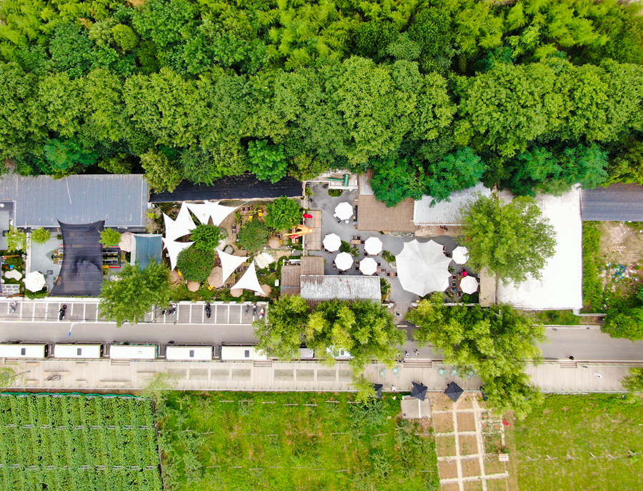 位于秦岭脚下的陕西省西安市鄠邑区栗峪口村,一家由废弃粉石厂改造而成的咖啡馆,员工基本来自村民(2024年6月20日摄,无人机照片)。新华社记者 蔡湘鑫 摄