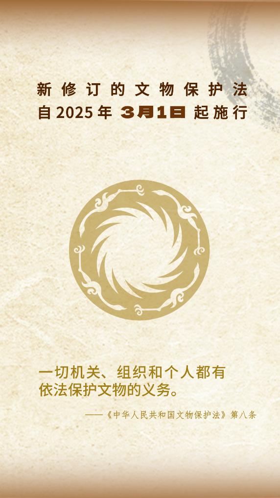 新华社北京3月1日电(记者施雨岑、胡梦雪)十四届全国人大常委会第十二次会议2024年11月8日表决通过新修订的文物保护法,自2025年3月1日起施行。记者3月1日从国家文物局获悉,为切实做好相关工作,中共中央宣传部、文化和旅游部、国家文物局、司法部、住房城乡建设部、全国普法办公室近日联合印发关于学习宣传贯彻《中华人民共和国文物保护法》的通知。