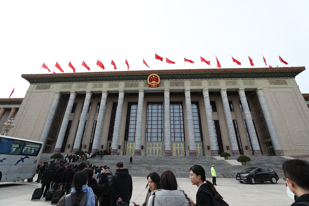 3月3日,全国政协十四届三次会议新闻发布会在北京人民大会堂举行,大会新闻发言人刘结一向中外媒体介绍本次大会有关情况并回答记者提问。图为记者在人民大会堂外排队入场。新华网记者 王翰林 摄