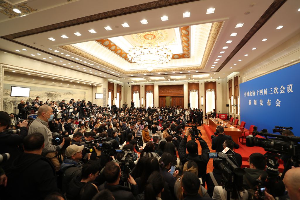 3月3日,全国政协十四届三次会议新闻发布会在北京人民大会堂举行,大会新闻发言人刘结一向中外媒体介绍本次大会有关情况并回答记者提问。图为新闻发布会现场。新华网记者 王翰林 摄