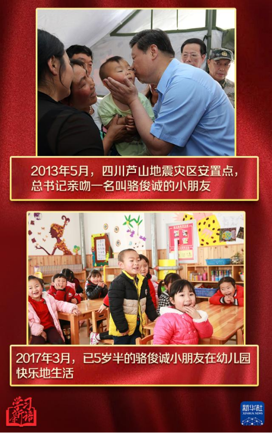 2013年芦山地震发生后,总书记亲赴灾区看望慰问受灾群众。在芦山县体育馆安置点帐篷内,总书记用手捧着1岁多的骆俊诚小朋友的小脸蛋,轻轻亲吻。看着数年后的照片中,已经5岁半的小家伙在芦山县幼儿园快乐地生活,总书记脸上露出欣慰的笑容。