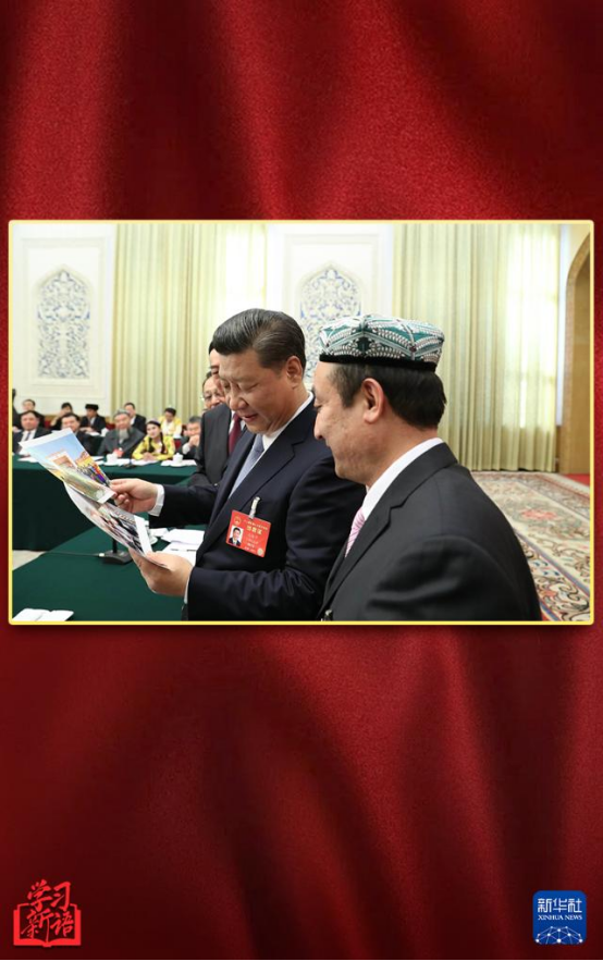 习近平总书记望着一张特殊的“全家福”,对来自和田地区策勒县策勒乡巴什玉吉买村的买买提依布热依木·买买提明代表亲切地说。