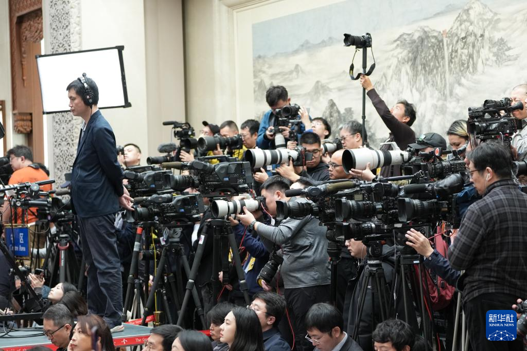 3月4日,十四届全国人大三次会议在北京人民大会堂举行新闻发布会。大会发言人娄勤俭就大会议程和人大工作相关问题回答中外记者提问。这是记者举手提问。新华社记者 郑焕松 摄