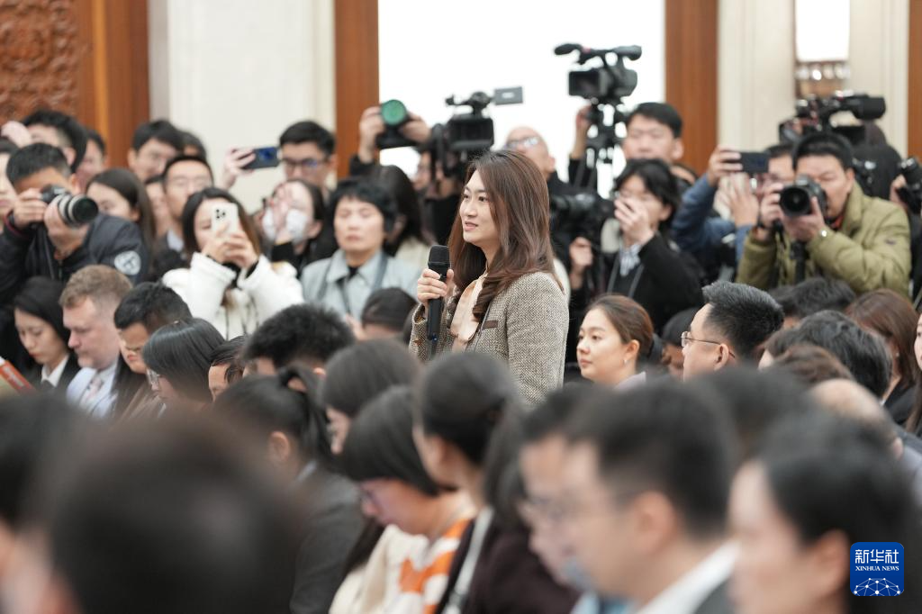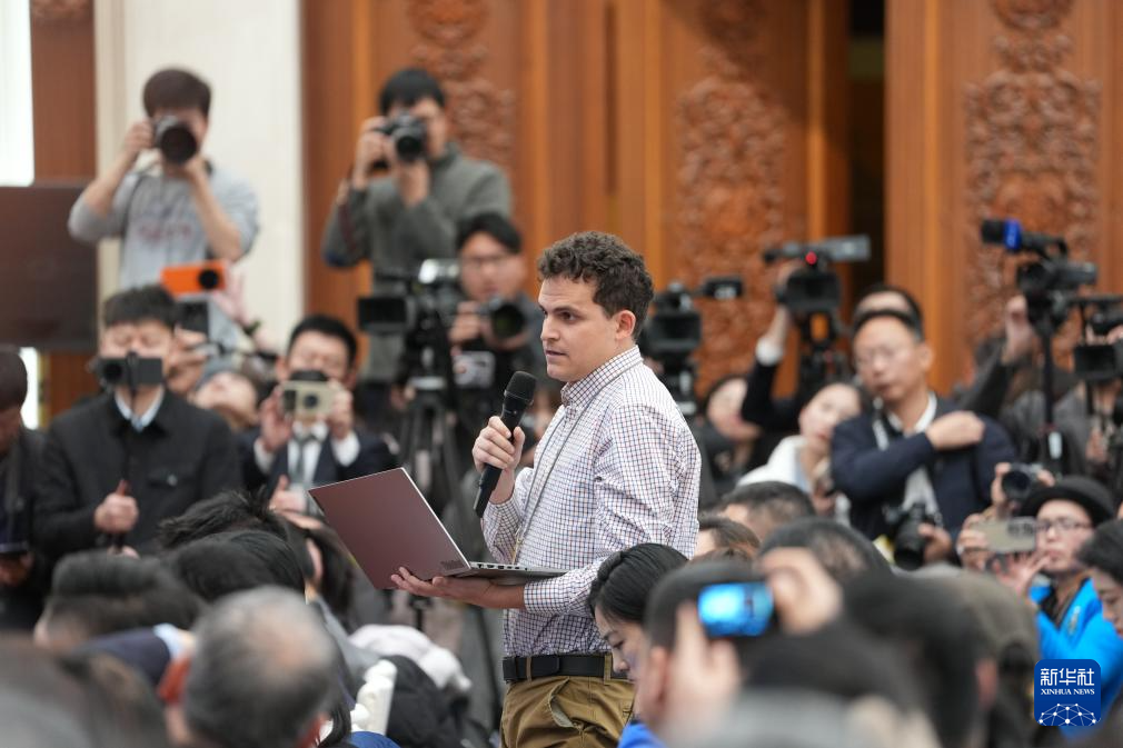 3月4日,十四届全国人大三次会议在北京人民大会堂举行新闻发布会。大会发言人娄勤俭就大会议程和人大工作相关问题回答中外记者提问。这是记者在发布会上提问。新华社记者 胥冰洁 摄