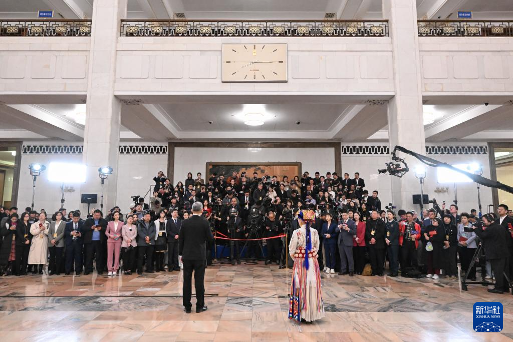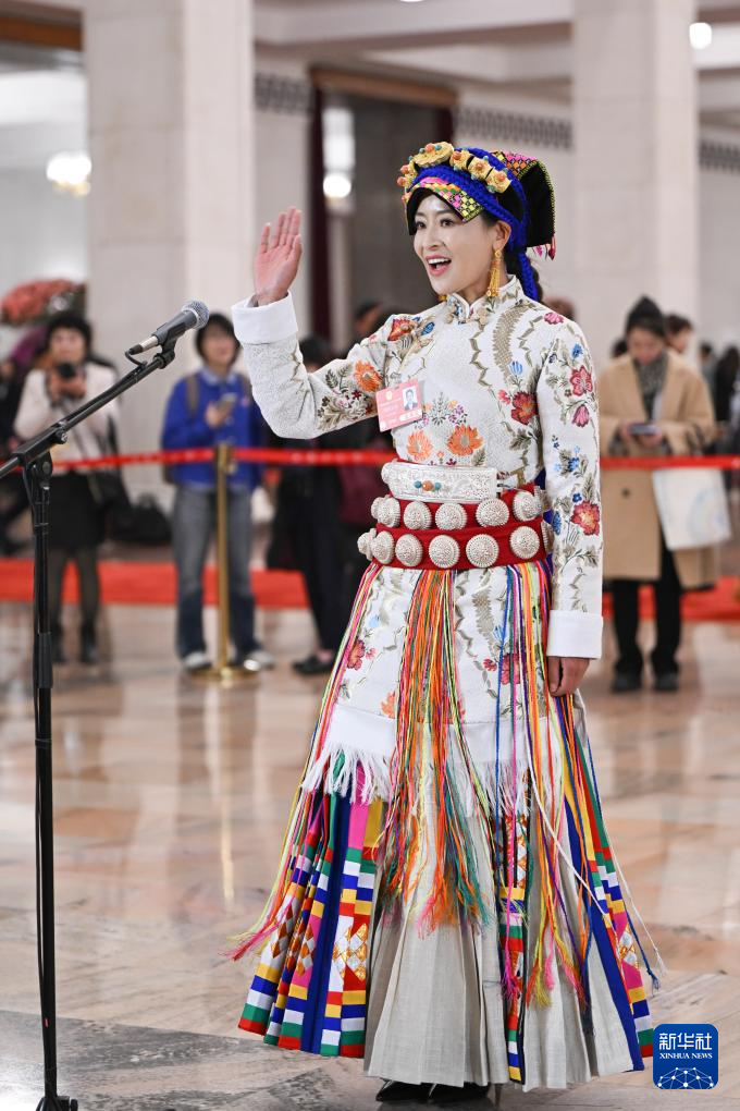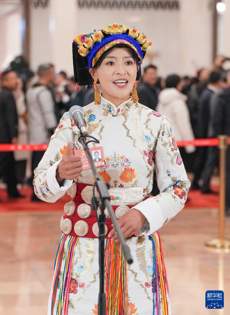 3月5日,第十四届全国人民代表大会第三次会议首场“代表通道”集中采访活动在北京人民大会堂举行。这是全国人大代表格西王姆接受媒体采访。新华社记者 胥冰洁 摄
